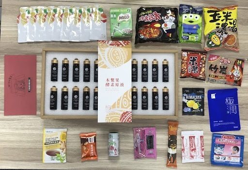 木鱉果酵素、樹葡萄酵素、美陸、泡麵、各種餅乾、飲料