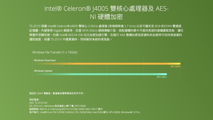提供 QNAP 官網提供的速度,搭配 Windows 的 10GbE 環境可達到上傳 892MB/s,下載 982MB/s 的速度。
