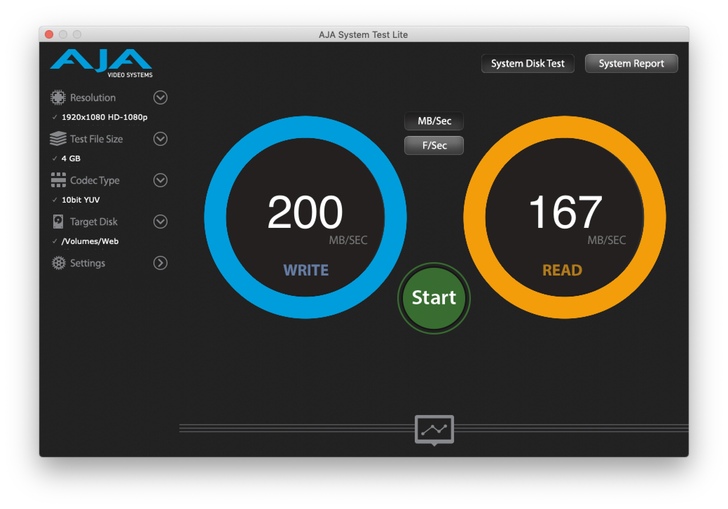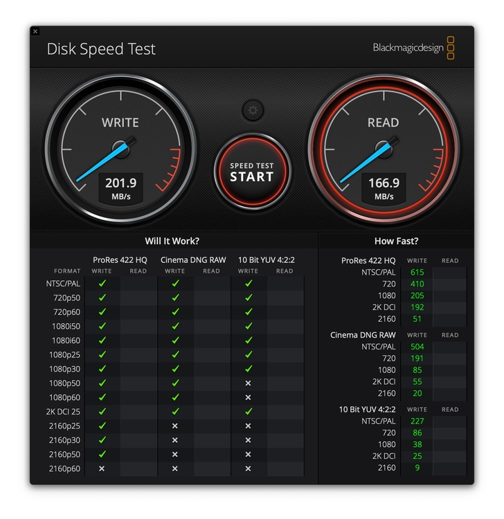以 Blackmagic Disk Speed Test 測速,結果也差不多。感覺並沒有完全發揮出 5GbE 的效能,只有大約 2.5GbE 的速度,只比原生的 GbE 快一倍。嘗試調整巨型封包的設定且更換其他支援 10GbE 的網路線仍無顯著改善。不過當作一般家用,加上 AP 速度也不在得有這麼快,對於一般家庭來說是綽綽有餘了。