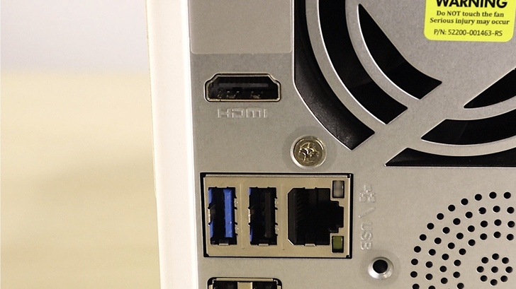 TS-251D 也很適合作為小型家庭媒體中心,其配備的 HDMI 規格為 HDMI2.0,這是 TS-251D 相較上一代 TS-251B HDMI1.4 的小升級,但影響很明顯。HDMI2.0 可支援 4K 60FPS 的畫面輸出至電視 。連結時也要留意選用的 HDMI 線的規格,才能達到完整的輸出效果。雖然 HDMI 的位置離機殼很近,乍看之下會覺得卡到機殼,實際測試接頭較突出,所以線材接頭不會卡到機殼。