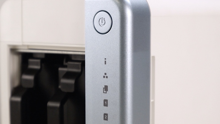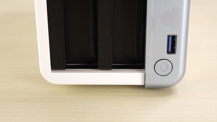 TS-251D 右方的控制面板是,可以很好的與 TS-251B 的香檳色區分。控制面板由上至下有電源鍵、系統狀態、網路狀態、USB、磁碟 1、磁碟 2。