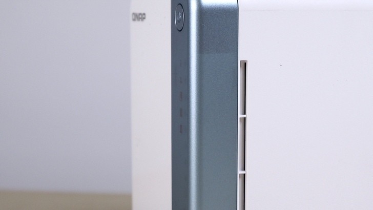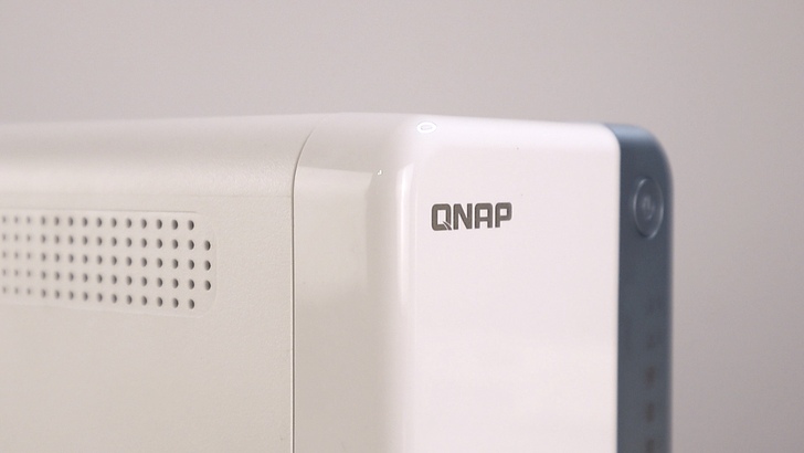 圓弧小巧的外觀設計,雖然是機身主要是塑膠外觀,但是像前面板表面非常平滑,做工質感也相當不錯,保養擦拭也算方便。正面左上方有 QNAP Logo。