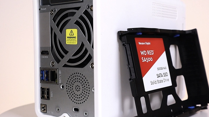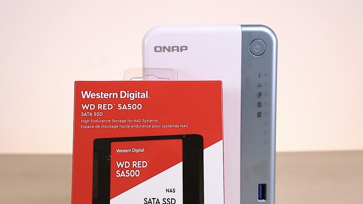 這台 2bay NAS TS-251D 是 QNAP 近期推出的機種,接續 TS-251B 的入門定位,算是前一代的小升級。在外觀上的造型基本一樣,但仍能從正面右方的控制面板顏色來區隔。搭配的磁碟是 Western Digital WD RED SA500 SATA SSD 500GB 兩顆。