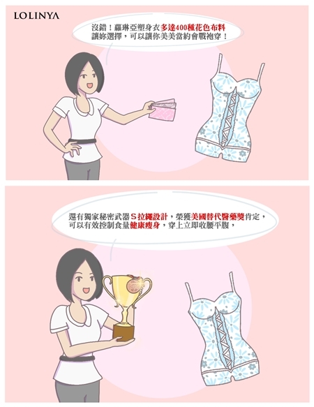 蘿琳亞塑身衣擁有多達400種花色布料可選擇,可依自我搭配需求打造出獨一無二的塑身衣,且有榮獲美國替代醫藥獎肯定的S拉繩設計,有抑制食量的效果,不需要辛苦忌口,照常吃也會瘦,同時幫妳纖腰平腹,每天穿著它,不知不覺的瘦下來,輕鬆簡單就能擁有漂亮身材曲線。
