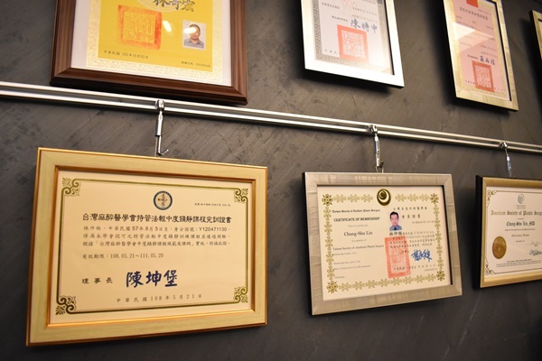 牆上掛的都是醫師林仲樞的執照、證書等等,讓人感到安心。