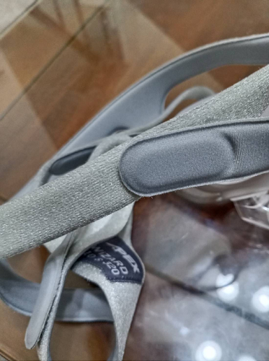 材質有點類似尼龍布料服貼柔軟摸起來很舒服,就像毛巾敷在臉上的那種感覺,所以臉上不會有頭帶的壓痕。魔鬼氈的品質也不錯,刺邊不容易卡毛絮或塌掉,這種比較不會因為經常撕黏而失去黏性。