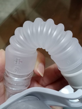 接在面罩下面的管子是軟的,翻身是可以跟著轉的,不用擔心翻身時面罩會「脫軌」