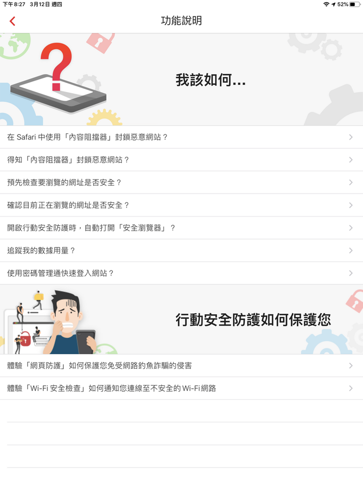 ▲【功能說明】基本上就是針對IOS趨勢行動安全防護的功能介紹講解,以問題式的方式說明,這樣讓使用者較容易找到自己想要的解說
