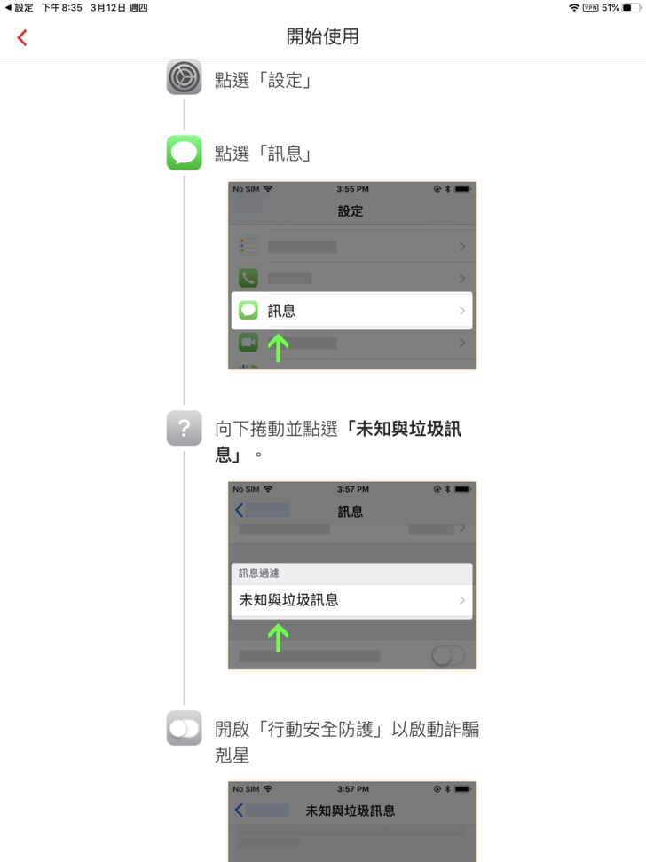 ▲【詐騙剋星】通常詐騙集團會用電話、簡訊、通訊軟體EX:LINE等方式進行金錢的詐騙,所以針對簡訊的部份IOS趨勢行動安全防護,也進行了防護,而且設定很容易,這個Android 系統好像就沒有