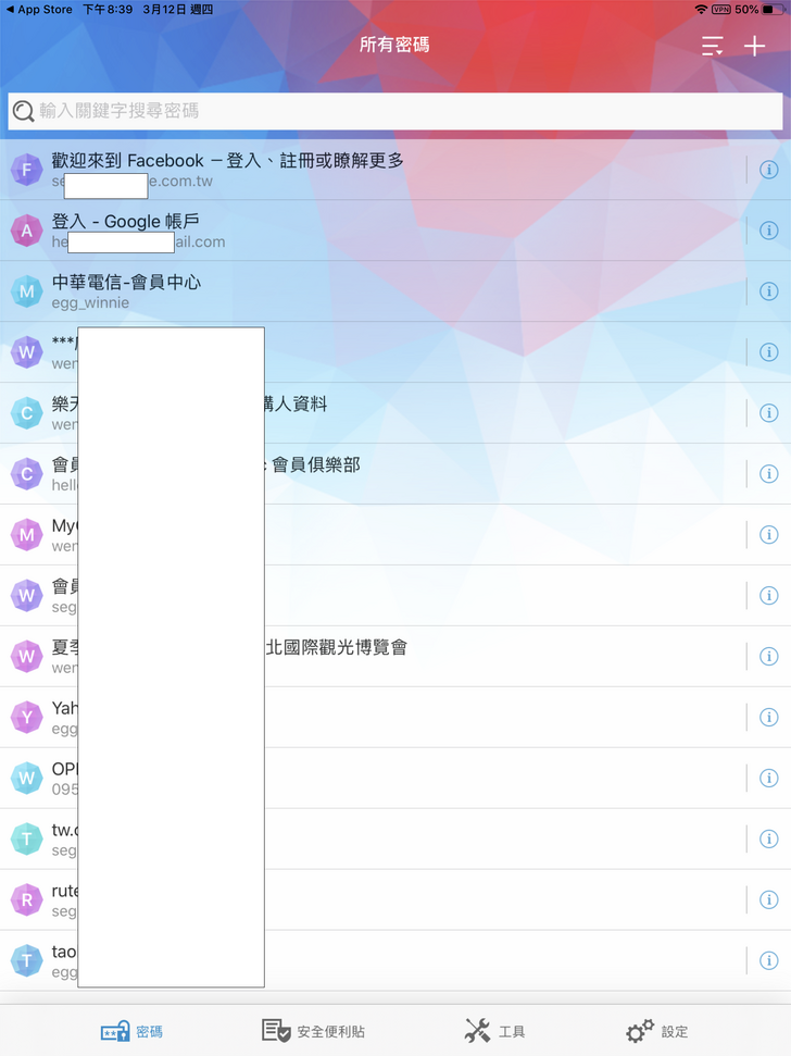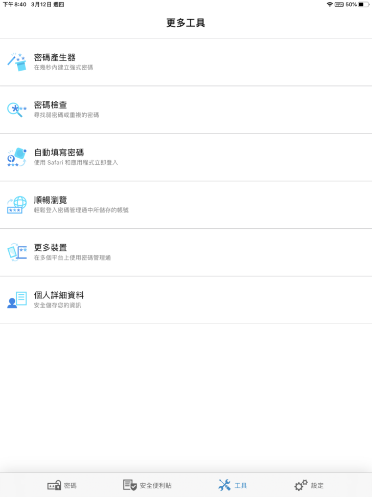 ▲基本上IOS系統的密碼管理通功能上跟Android 系統大同小異,一樣只有四大功能區【密碼】、【安全便利貼】、【工具】、【設定】