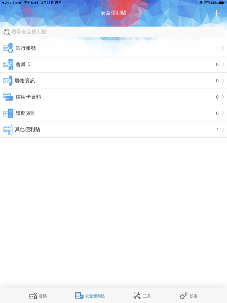 ▲【安全便利貼】就把它想成記密碼的小冊子,只是這個功能有分類,這樣就可以依照分類去尋找,不用一個一個查看。