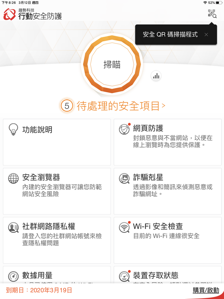 首先我們先來下載IOS趨勢行動安全防護APP,下載後發現在Android 系統下QR掃瞄程式是需要另外下載一個APP,但在IOS系統下是合併在同一個APP內,對於喜歡桌面簡單的使用者,這點應該可以吸引他們。