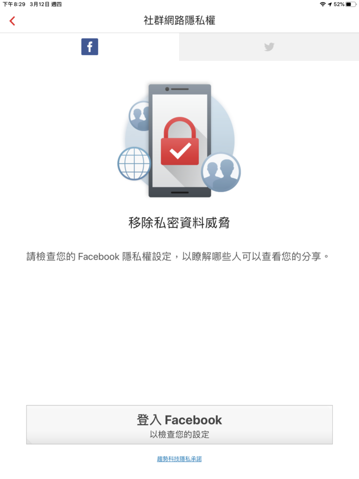 IOS趨勢行動安全防護APP分成【功能說明】、【網頁防護】、【安全瀏覽器】、【詐騙剋星】、【社群網路隱私權】、【WI-FI安全檢查】、【數據用量】、【裝置存取狀態】