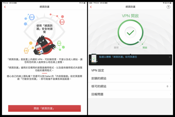 ▲【網頁防護】開啟VPN防護主要是用來「防範網站威脅」並提供「家長監護」功能,它內建在 iOS 版趨勢科技行動安全防護當中。它能有效避免你瀏覽惡意網站,幫你的孩子過濾並阻擋不當網站。它可攔截搜尋的查詢字串與查詢結果,確保家人不會瀏覽到任何可能竊取你身分資訊或下載惡意程式到你裝置的網站,並且根據裝置預先設定的家長監護條件來幫你過濾網站。此外,它還可利用裝置上暫存的資料來檢查網址,因此可加快瀏覽速度。