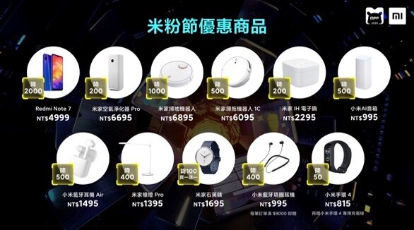 2020小米米粉節自4月7日10時起至4月12日23:59分止,推出超過100個品項直降大優惠,包括曾奪下「最佳中階旗艦手機」之一的Redmi Note 7 (4GB+128GB),直降新台幣$2,000元,超值特惠價只要新台幣$4,999元;「中階旗艦入門價」的Redmi Note 8T(3GB+32GB)也首度直降新台幣$500元,特價台幣$4,099元;多款熱銷智慧家庭裝置也祭出超殺好康回饋,包括小米空氣淨化器 Pro,直降新台幣$200元,特惠價新台幣$6,695元;米家掃地機器人直降新台幣$1,000元,特價新台幣$6,895元;米家掃拖機器人1C直降新台幣$500元,特價新台幣$6,095元;米家 IH 電子鍋直降新台幣$200元,特價新台幣$2,295元;小米AI音箱直降新台幣$500元,特價新台幣$995元;米家檯燈Pro白色直降新台幣$400元,特價新台幣$1,395元;小米藍牙耳機 Air直降新台幣$500元,特價新台幣$1,495元;小米藍牙項圈耳機直降新台幣$400元,特價新台幣$995元;小米手環 4直降新台幣$50元,特價新台幣$815元,再送小米手環4專屬充電線。(實體門市優惠謹依各門市公告為準。)
