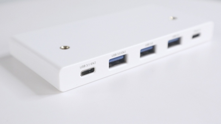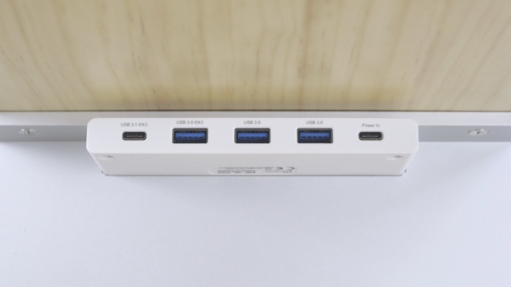 JCT425 的 hub 其中一面有一個 USB Type C、三個 USB Type A 以及一個 USB Type C 的電源輸入孔。hub 可以裝、也可以不裝,可自己決定。如果是有裝 hub 的那邊支架,支架鎖上木板時只要鎖兩個即可,因為 hub 會擋到中間的螺絲,而另一邊就可以完整裝上三個。