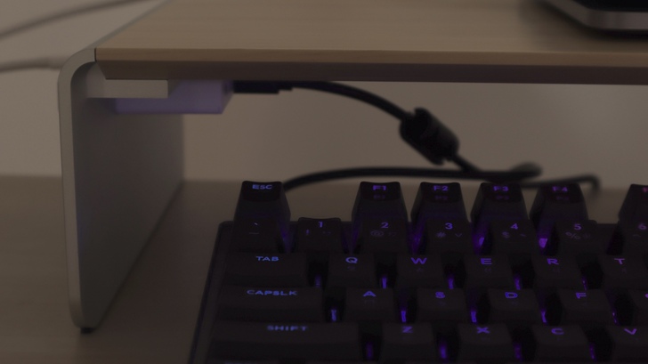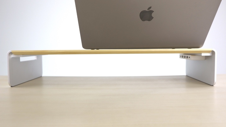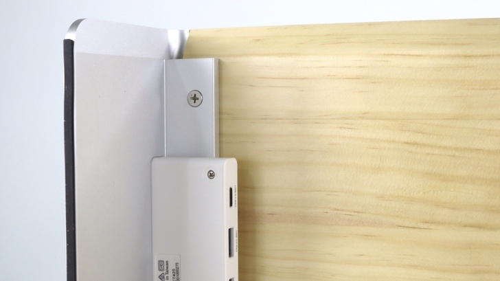 白色的 Type C hub 與木板間的空間,也就是是鋁支架支撐的厚度,這個空間剛好可以用來整理線材,算是額外的小發現,不知道原設計者的用意是不是這樣。