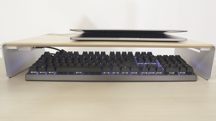 螢幕架下方騰出的空間相當大,寬度可以放下 108 鍵的鍵盤,仍有許多餘裕。或同時放下 Apple 的 Magic Keyboard 2 和 Magic TrackPad 2,甚至還有 83mm 左右的空間,可以直放入一支含殼的 iPhone 11 Pro。深度約為 247mm。