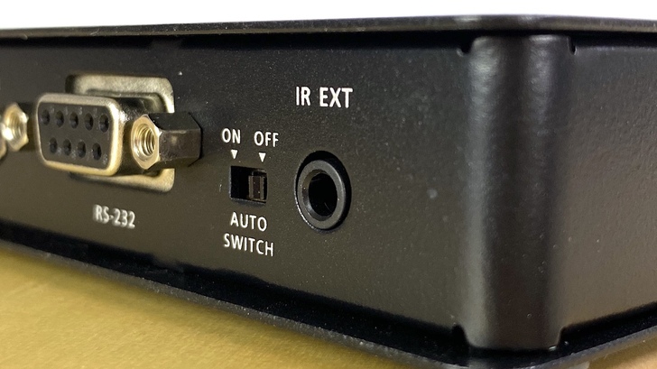 背後右邊有 RS-232 序列埠可以做系統控制、自動切換的開關、IR 遠端控制接孔。目前沒有 RS-232 的控制器,因此無法對此功能做測試,比較可惜。