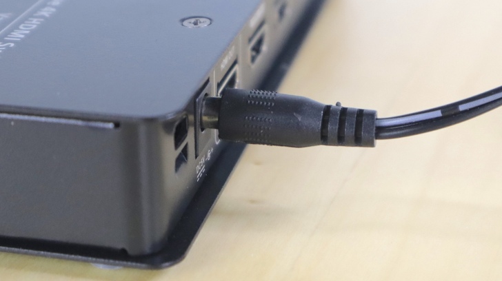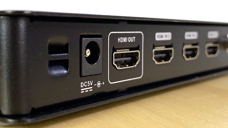 背後左側有防盜鎖孔、DC 電源輸入圓頭、HDMI output,中間則是三個 HDMI input。