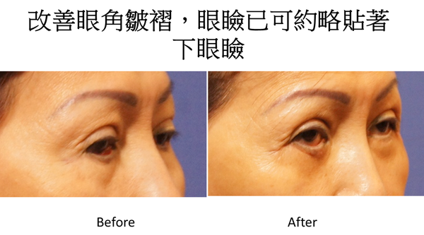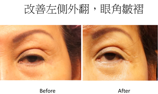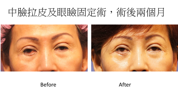這個患者林仲樞醫師利用中臉拉皮來解決最外層皮膚的不足,中、後層的纖維化孿縮變形,完全放鬆之後再加上一些組織襯墊,再加上兩側眼瞼固定術讓眼瞼能上移,約略蓋住眼珠下緣,至於淚溝部份用殘餘脂肪做轉位及移植,一併來解決殘餘的眼袋及淚溝。最後傷口修整關閉時,要特別注意眼角成形術,解決原來的皺褶,這個眼袋手術有點複雜,希望能解決患者多年來的困擾!
