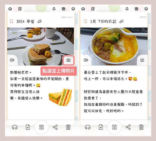 在日記內容上方,點選相機圖示,即可上傳照片,以「一張圖一段字」的方式記下片刻時光。