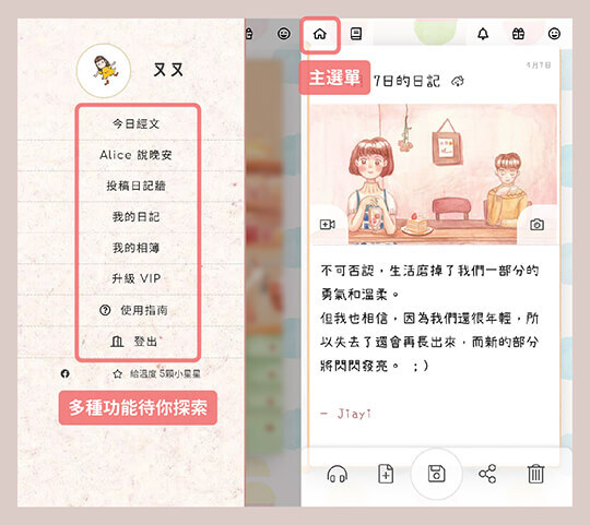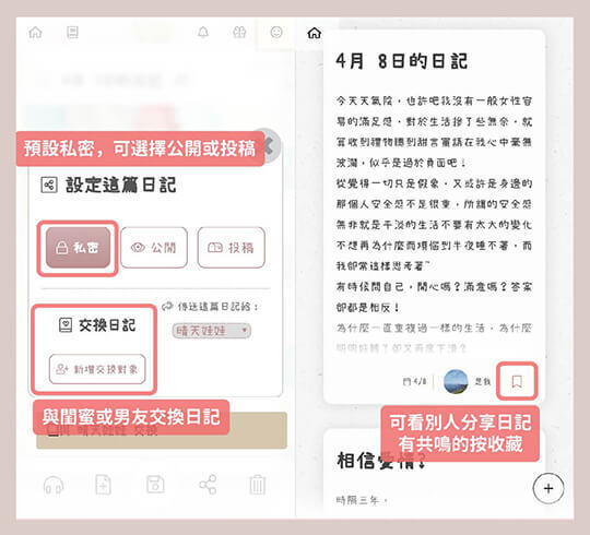 可以和大家分享自己現況,也可以觀看其他人的生活的功能,如果對對方的日記很有共鳴的話,也可以將它收藏到日記目錄。