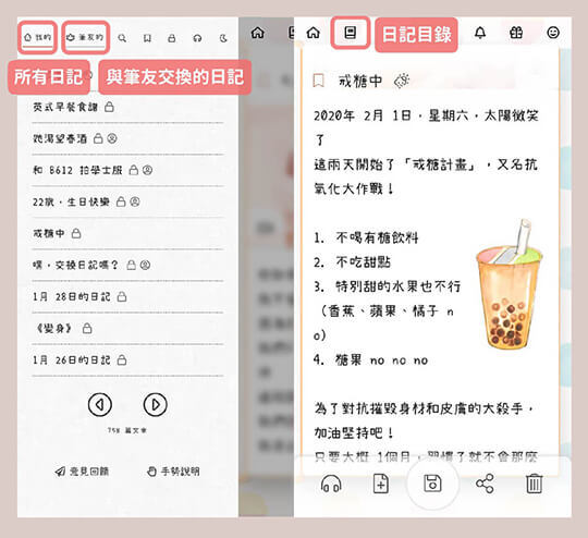 點選左上方書本圖示,裡面是你寫的所有日記以及與筆友的交換日記,篇名後不同的小圖示分別代表了「公開的」或「私密」。