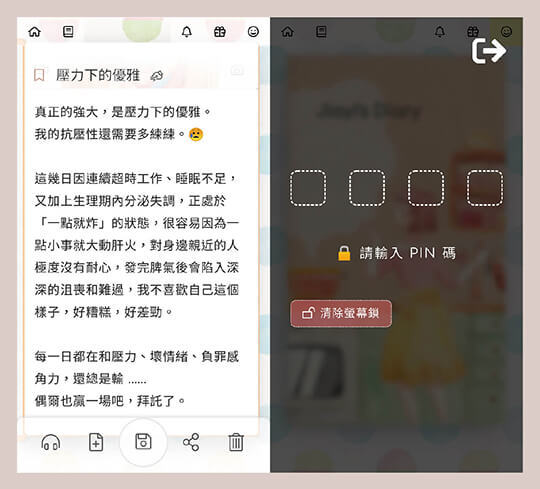 設定4碼的防窺螢幕鎖,進入溫度日記前都必須輸入密碼才能開啟,增加多一層的防護。就算別人拿到你的手機,也無法輕易偷窺你的日記內容,安全性更加提升。