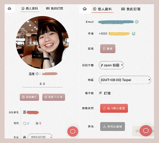 溫度日記不僅有療癒的空間讓你可以盡情抒發心情、為自己記錄生活,還有個人化的設定,可以編輯大頭貼、暱稱、日記本書名、字體,讓你可以量身打造一本屬於自己的溫度日記。
