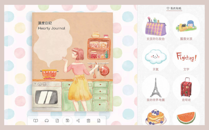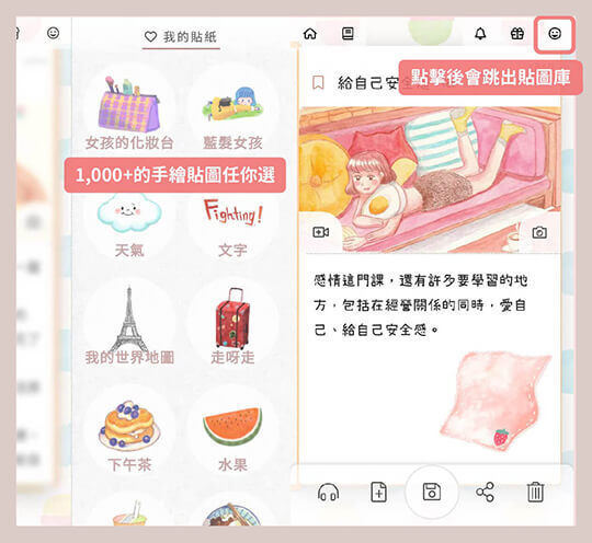 只有文字略無聊?點選右上角的笑臉圖示,就會彈出貼圖庫。圖庫內的素材擁有許多分類,包含著各色生活主題,可以依著日記內容選擇喜愛的貼圖。
