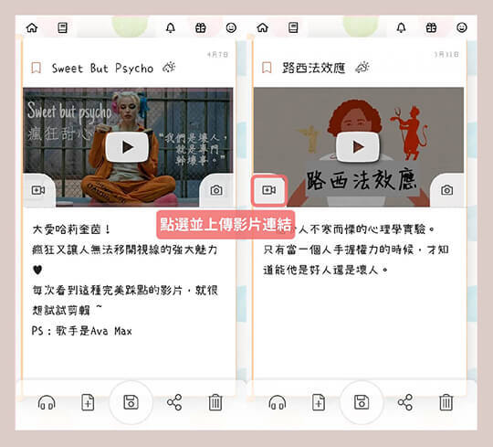 在日記內容上方,點選錄影機圖示,即可貼上youtube連結,方便收藏自己喜歡的歌曲、Youtuber影片、電影、動畫等,挺特別的功能。