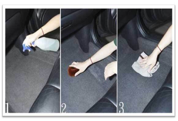 第4步.若打翻飲料、湯或菜飯時,應立即補救清潔清潔地毯及腳踏墊,不然時間一久,就難以清理。可使用清水直接沖洗,若遇到難洗的污漬,可使用專用的去漬清潔劑處理和刷子畫圓刷洗,以強力水柱來回沖洗,將髒汙泡沫一併沖走,但此時會殘留多餘水份,請於室外曬乾,若只是輕微受污,利用乾洗方式處理即可。倘若仍無法完全處理,則可請請專用汽車美容公司處理。
