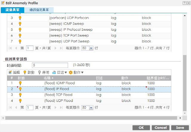 ▲ ATP的入侵防禦與入侵偵測防禦也支援異常流量於通訊協定的偵測,將UDP Flood臨界值設在100,像先早自行編譯的Udpclient就會被偵測到UDP Flood。