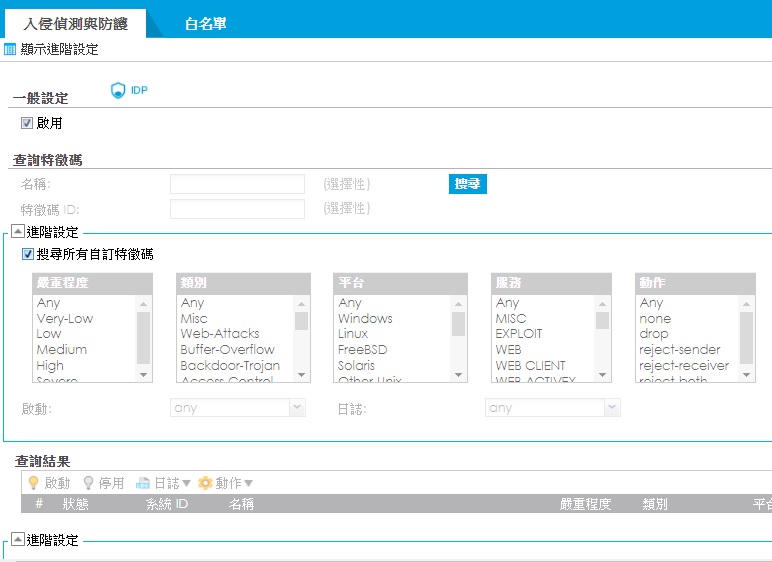 ▲ 入侵防禦與入侵偵測防禦絕對是ATP100的重頭戲,在筆者管理過的J牌與F廠防火牆機種中,是比較少看到入侵防禦與入侵偵測的足跡的,ATP100可以設定的掃描偵測項目大致已TCP、UDP、IP、ICMP的連接埠掃描與Sweep為主。