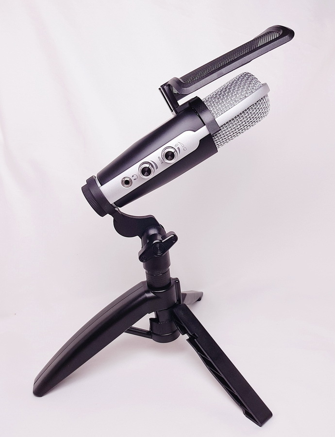 ▼ 麥克風 側面:上面旋鈕是調整麥克風音量,按押則是開關靜音、中間旋鈕是調整監聽音量、下面是監聽耳機的插孔。