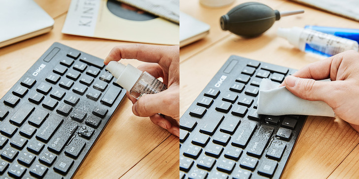 ▲接著使用抗菌清潔液噴灑髒污位置,最後再透過超纖擦拭布擦拭乾淨,才算是做到完整的清潔程序,畢竟鍵盤上的細菌數是馬桶的 400 倍,清潔工作一定要做確實啊!