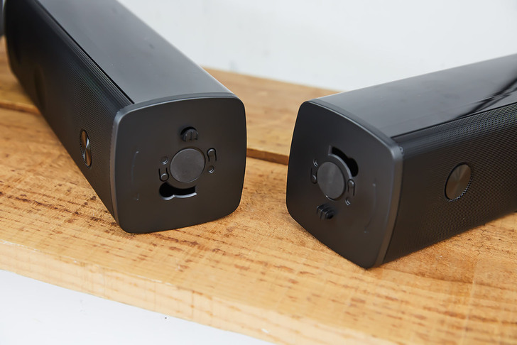 除了把喇叭擺在電視兩側的分離式擺法,兩組 3 吋全頻喇叭也支援壁掛,但除了壁掛還有更酷的擺法,那就是把兩組合併為一組,就像是喇叭界的變形金剛。