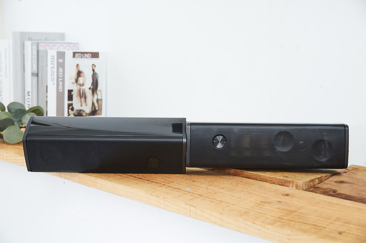▲只要像照片這樣對準扣住再轉緊,兩組3吋全頻喇叭就瞬間變身類似 Soundbar 的單件式長型喇叭模式。