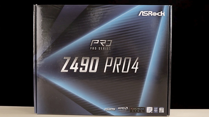 ASRock Z490 Pro4 藍黑色的正面包裝,板子的規格是 ATX。