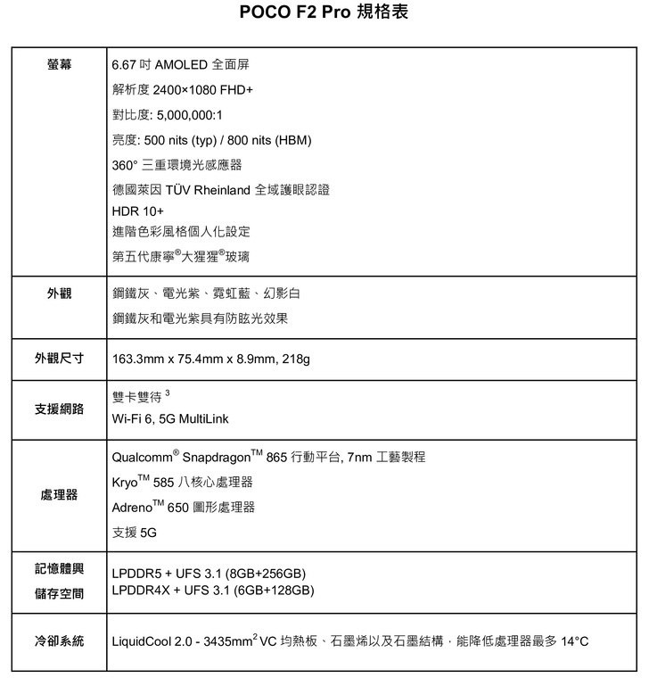 POCO F2 Pro 提供6GB+128GB及 8GB+256GB 兩種規格,定價分別為€499歐元起及€599歐元起。