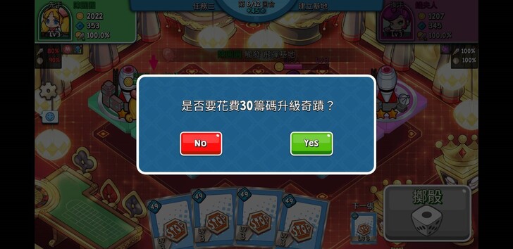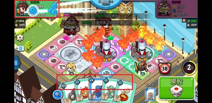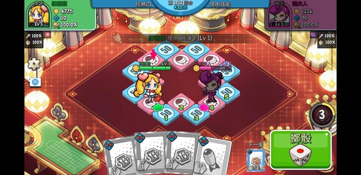 所以保有足夠的籌碼是很重要的,若卡牌出完或是行動力不夠了(卡牌會變成灰色)就可以按下擲骰來往前,並換對方的回合。