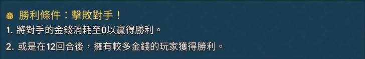 這次回合制的遊戲通常在5分鐘內可以決勝負,有2種勝利條件如下
