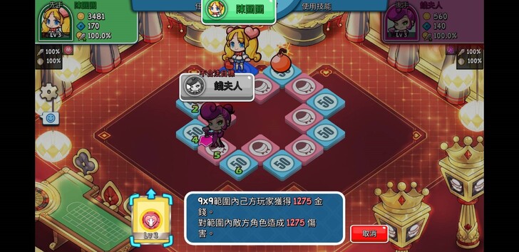 然後根據玩家選的主角都會有不同的主要技能,例如糖糖的主動技功效是在9X9格的範圍內玩家可以獲得大量的金錢(HP),然後讓對方角色受到相同數字的傷害,在初期通常這種王牌一出就贏啦XDDD