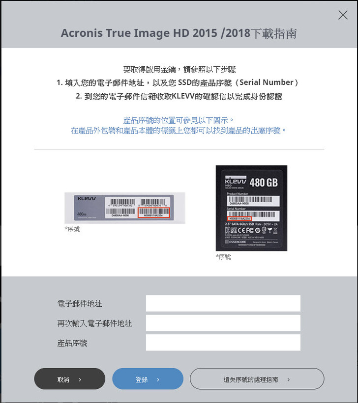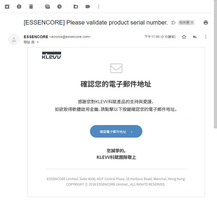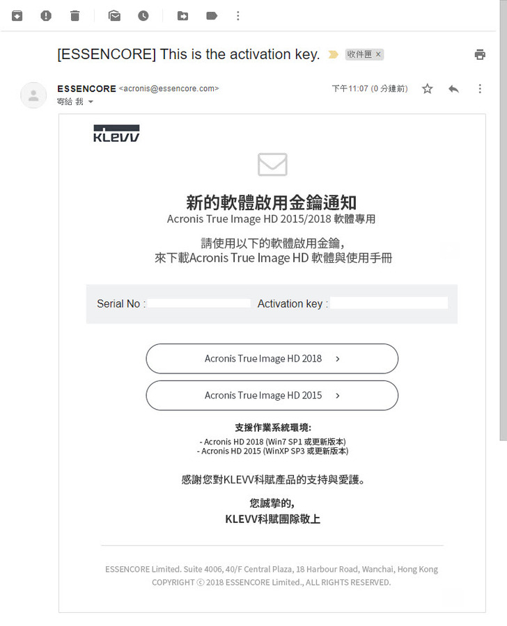 信箱地址確認後即可收到essencore原廠寄給你的Acronis True Image 2015/2018 OEM產品序號