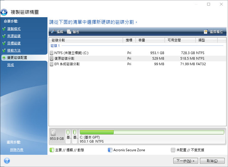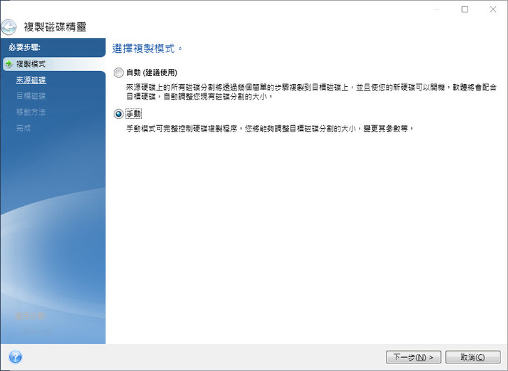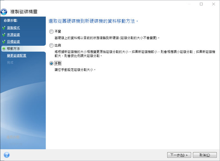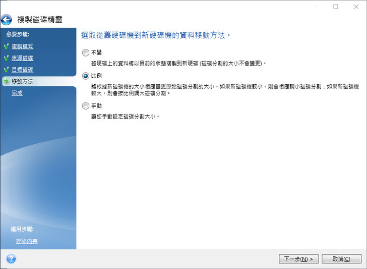 比例(根據新SSD的大小變更為對應磁碟分割大小做比例調整) 以及手動方式