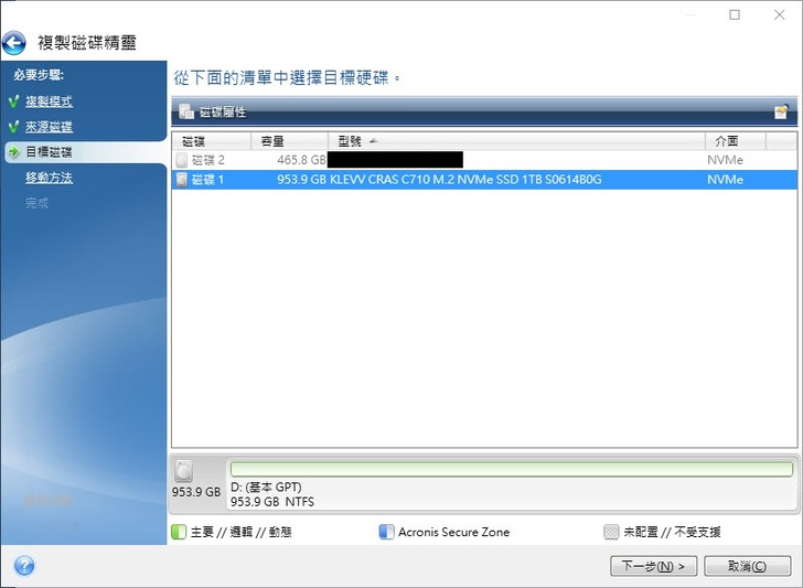 移動方法分為不動(將以原SSD的狀態直接移動到新SSD上、容量數值不會改變)