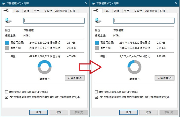 轉移前後系統碟大小比較,容量差了近一倍