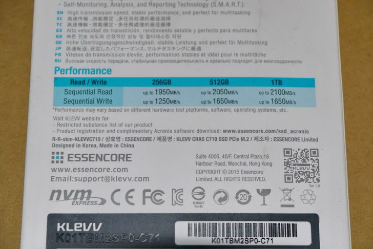 下方為各容量的讀寫效能、以及NVMe與各項安規與不可丟棄標誌皆印在此