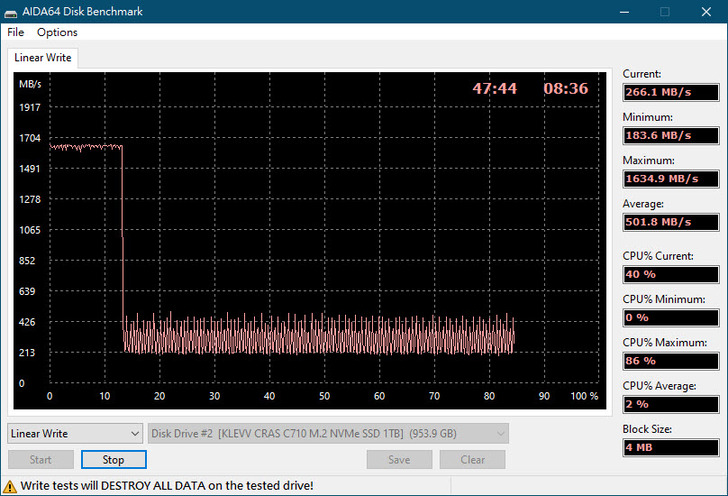若是SLC快取用完之後,寫入速度就會馬上下降到500MB/s以下...